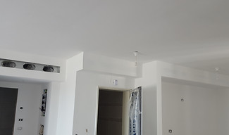 בשלב הראשון יישרתי את ההנמכות והבליטות. שילבתי בגבס תאורה שקועה פונקציונלית ותאורת אווירה נסתרת. ע"מ להמשיך את קו הנמכת התקרה מעל הארונות הגבוהים במטבח אל הכניסה לבית שילבתי משרביית גבס וכך נוצרה מבואה קטנה.